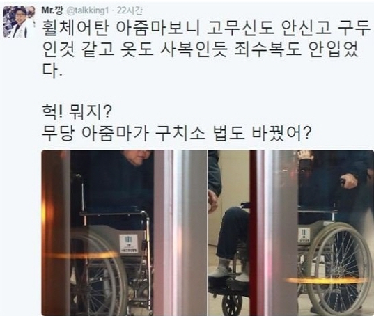 휠체어 타는 순간 그 아줌마는 구치소에서 자기 옷 빨래도 지 밥그릇 설거지도 안하게 되는 자격을 얻는다. 헉 뭐지? 휠체어 탄 모습 보니 고무신도 안 신고 구두인 것 같고 옷도 사복인 듯. 죄수복도 안 입었다. 구치소 법도 바꿨느냐”고 남겼다고 하는데요.