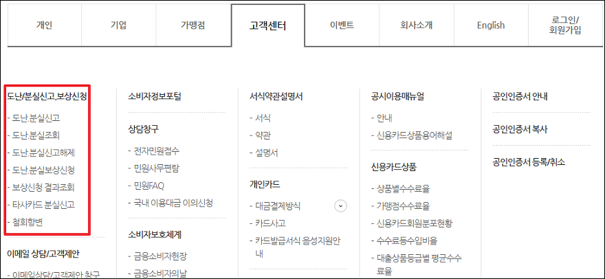 카드 분실을 했을 때 가장 먼저 해야하는 행동이 고객센터에 전화하여 이용정지 신청을 하는 것입니다. 그러나 찾은 경우 3가지 조건에 해당하는 경우만 처리가능합니다. ① 공인인증서 필수 ② 해당 카드의 도난/분실 신고일이 최근 1년 이내인 개인 신용카드 ③ 가족카드의 분실신고 해제는 본인회원 로그인으로 해제 가능