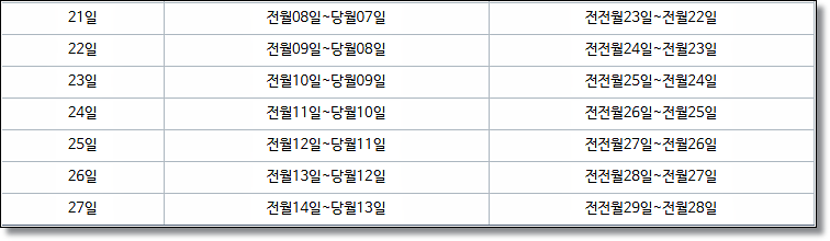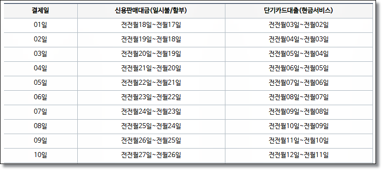 다음은 결제일별 이용기간(1일~10일) 안내입니다. 1일은 전전월 18일부터 전월 17일 이용대금이 청구되며 현금서비스의 경우 전전월 3일부터 전월 2일까지 사용한 요금을 내야합니다. 2일부터는 하루씩 밀려서 낸다고 생각하시면 됩니다.
