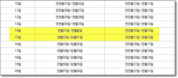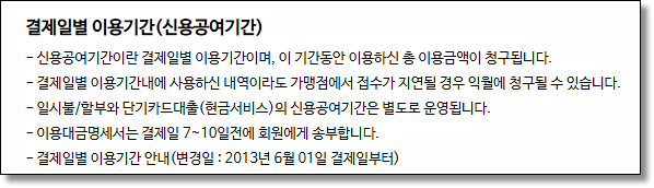 가장 많이 선호되는 결제일은 바로 14일과 15일입니다. 그 이유는 사진에서 볼 수 있듯이 14일은 전월 1일부터 전월말일에 사용한 대금, 15일은 전월 2일부터 당월 1일에 사용한 이용대금이 청구되어 계산하기가 수월하기 때문입니다.