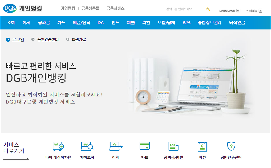 컴퓨터 또는 스마트폰에 공인인증서가 설치되어 있는 분이라면 대구은행 홈페이지와 모바일앱을 통해 통장 잔고를 확인할 수 있습니다. 공인인증서가 아직 없으신 분들은 가까운 영업점을 방문해 인터넷뱅킹 사용신청을 해 발급받은 보안카드를 홈페이지에 등록하시면 공인인증서가 발급됩니다.