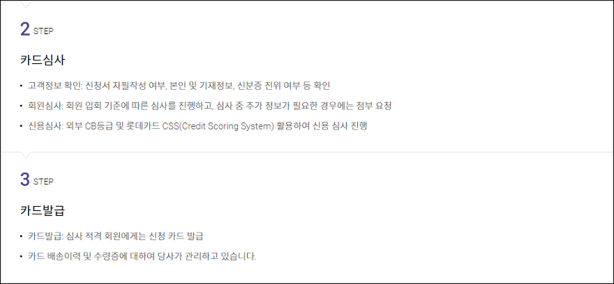 신청서를 접수하면 롯데카드 자체 내에서 심사를 진행하고 외부 CB등급 및 롯데카드 CSS를 활용하여 신용 심사가 진행됩니다. 이를 통해 심사 적격여부를 가리고 조건을 충족하는 사람은 자택으로 카드를 발송해주고 있습니다.