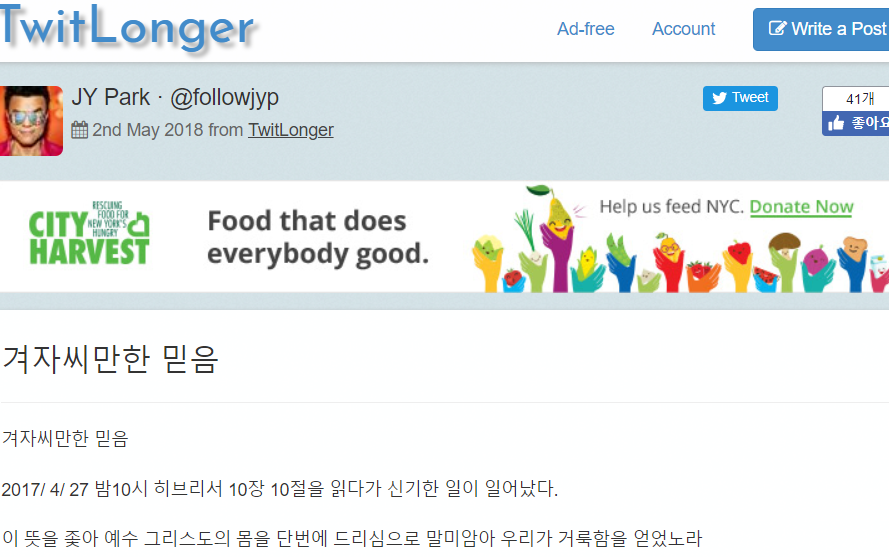 [박진영 트위터 간증문 겨자씨만한 믿음]
