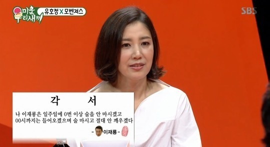 유호정 - "평소 술을 즐겨마시는 남편을 알기에 결혼 초 술을 안마실것을 맹세하는 금주각서를 썼어요. 근데 현실적으로 그건 불가능할거 같아 기한을 정하는 걸로 각서를 수정했지만, 결국 그것도 지켜지지 않았죠"