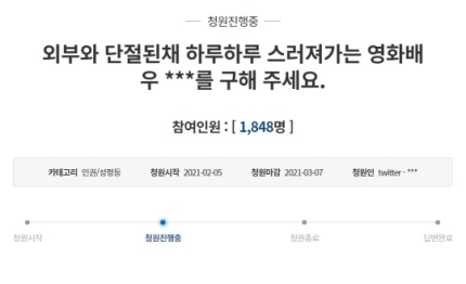 청와대 국민청원 게시판에는 5일 '외부와 단절된 채 하루하루 스러져가는 영화배우 OOO를 구해주세요'라는 글이 올라왔다. 현재 게시물은 관리자에 의해 실명이 가려진 상태 입니다.