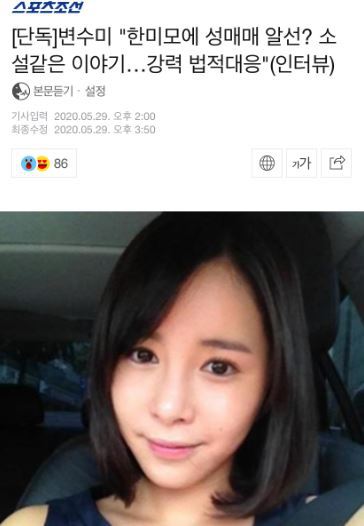 한미모에게 피소당한 배우 변수미가 입장을 밝혔다.변수미는 29일 한 인터뷰에서 "BJ 한미모가 주장하는 성매매 알선은 사실이 아니며 소설과 같은 이야기"라고 반박했다.