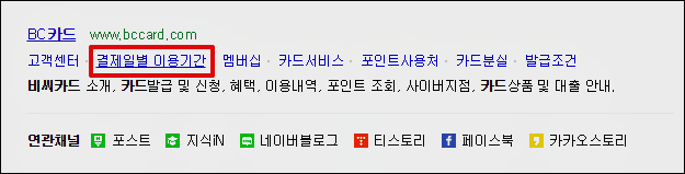 BC카드 결제일별 이용기간은 네이버에서 검색하시면 바로가기 버튼이 나옵니다. 또는 비씨카드 홈페이지 - 고객센터 - 카드이용안내 - 국내이용으로 들어가시면 확인할 수 있습니다.
