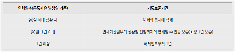 부득이하게 연체되는 경우 90일 이내 상환할 경우 해제와 동시에 기록이 삭제되며 그 이후부터는 연체일부터 상환일 전까지 연체일 수 만큼 보존됩니다.