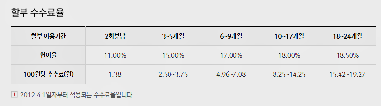 할부 수수료율은 다음과 같습니다. 할부개월과 연이율에 따라 수수료가 부과되는데 연이율은 신용등급에 따라 차등적용됩니다. 6개월 이상일 경우 100원당 4.96~7.08원의 수수료가 부과되는 만큼 할부를 이용하기 전에 마이BC - 카드이용관리에 들어가셔서 확인하시기 바랍니다.