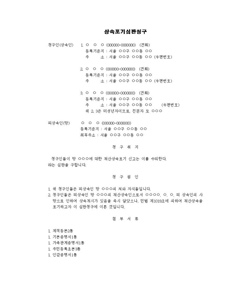 관할 법원에 서면으로 상속포기 신청서를 제출하는 것이 상속포기 절차의 핵심입니다. 구비서류는 피상속인의 제적등본, 말소자 주민등록등본 1통, 상속포기인의 가족관계증명서, 주민등록등본, 인감도장, 인감증명서 각각 1통을 준비해야 합니다.