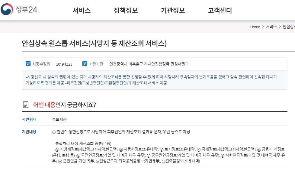 안심상속 원스톱 서비스는 주민센터를 방문해 피상속인의 금융거래조회, 국민연금 가입여부, 국세, 지방세 정보, 토지, 자동차 소유 여부 등을 한 번에 확인할 수 있고 사안에 따라 7~20일이 소요됩니다.