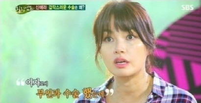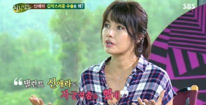 신애라 - “어느 날 갑자기 하혈을 하더라. 자궁근종이었다. 회복이 빠르다는 말에 적출을 택했다”, “의사는 임신 불가, 정신적 스트레스 등 부작용이 있다고 했는데 괜찮다고 했다”
