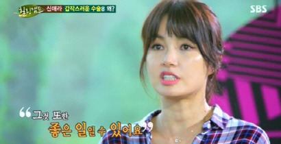 신애라 - “어느 날 갑자기 하혈을 하더라. 자궁근종이었다. 회복이 빠르다는 말에 적출을 택했다”, “의사는 임신 불가, 정신적 스트레스 등 부작용이 있다고 했는데 괜찮다고 했다”