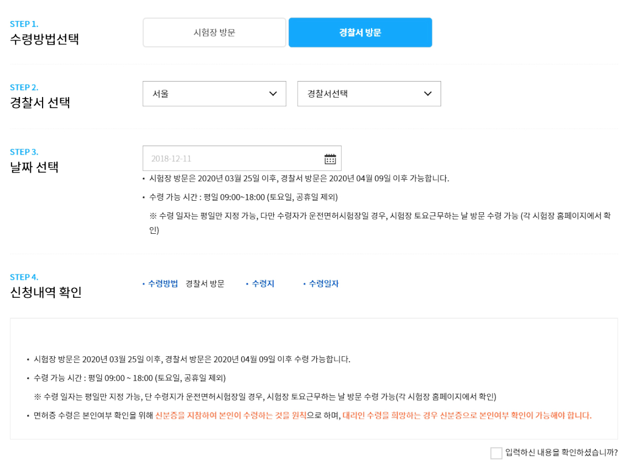 해당 사이트의 링크는 아래를 통해 달아 둘 예정이니 인터넷을 통해 신청하고자 하신다면 아래의 링크를 이용하시면 됩니다. 하나 유의하셔야 할 점은 인터넷으로 신청한 경우에는 무조건 방문해서 수령을 해야 한다고 합니다. 이것도 이유는 모르겠지만 수령일과 수령지를 지정해서 운전면허증을 수령하러 경찰서나 운전면허시험장을 직접 방문해야 합니다.