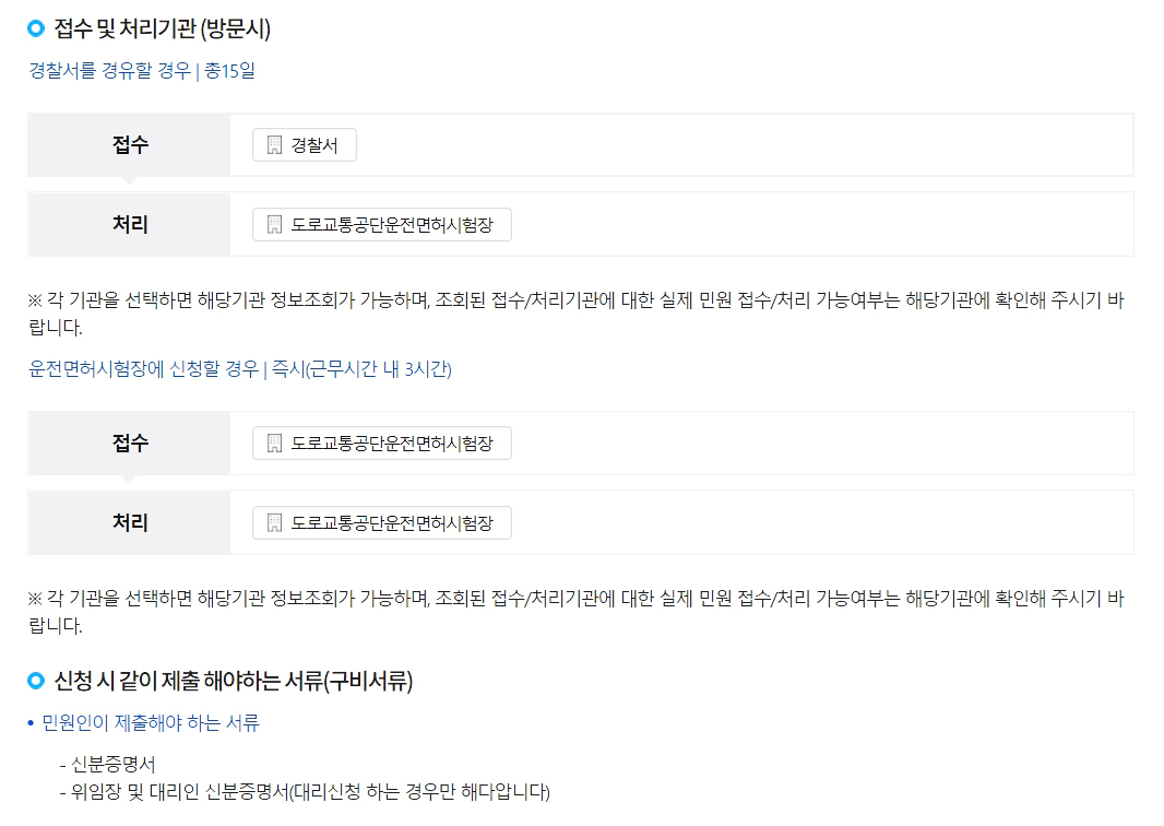 운전면허증 재발급 방법에는 3가지가 있는데요. 첫번째로는 가까운 경찰서나 교통 민원실을 직접 방문해서 재발급을 신청하는 방법이 있습니다. 그리고 경찰서가 아닌 운전면허시험장을 방문하는 방법도 있습니다.