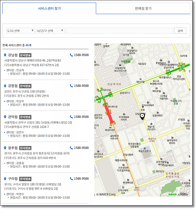 딤채 서비스센터는 각 지역마다 위치해있습니다. 김치냉장고 A/S가 필요한 경우 검색창에 거주하고 있는 지역을 검색하면 위치와 영업시간 등을 알 수 있습니다. 전화번호는 1588-9588로 동일합니다.