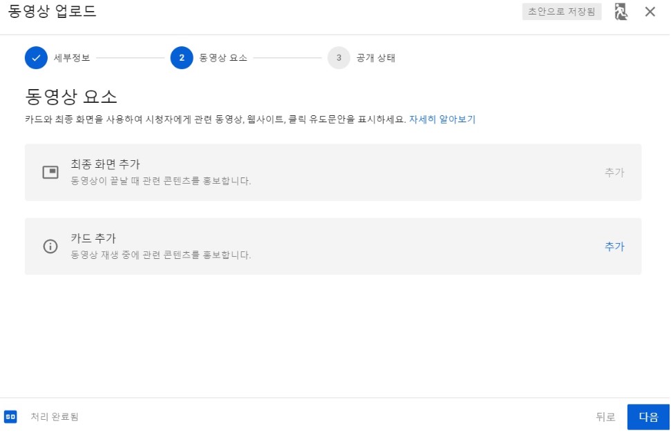 그 다음 유튜브 동영상 올리는법 단계로 동영상 요소를 설정할 수 있습니다. 여기서 두 항목을 확인할 수 있는데요. 최종 화면 추가는 유튜브 동영상 후반 끝에서 다른 동영상 소개 또는 유튜브 구독 버튼을 나타내는 것 등을 설정하는 것입니다.