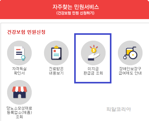 인터넷으로는 먼저, 국민건강보험공단 홈페이지에 접속하신 후, 공인인증서를 통해 로그인을 합니다. 그리고, 자주 찾는 민원서비스 -> "미지급 환급금 조회" 메뉴를 클릭하여 이동합니다.