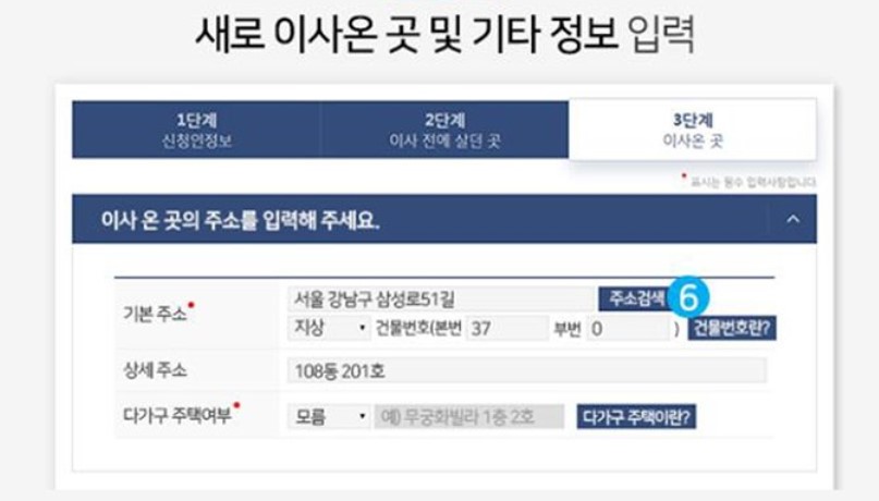 전입신고 3단계에서는 이사온 곳의 주소를 상세하게 입력하고, 다가구 주택여부 및 이사온 사람끼리 세대구성을 하였는지 이사온 곳에 기존 살던 세대주가 있는 경우인지 체크하고 우편물 주소이전 서비스 신청 및 초등학교 배정정보 작성 등을 신청하시면 됩니다.