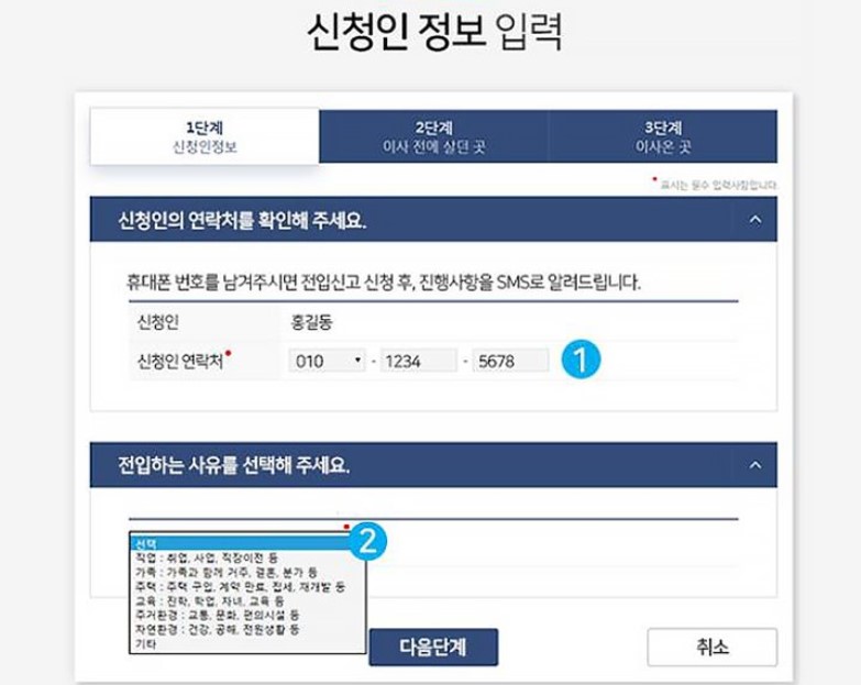 전입신고 과정은 3단계로 나뉘는데 1단계는 신청인 정보를 입력하는 것입니다. 신청인 이름과 연락처 입력 및 전입하는 사유를 선택해야 합니다. 사유는 취업, 직장이전 등은 직장을 선택하고, 주택구입이나 계약만료는 주택을 선택하시는 등 상황에 맞게 선택하시면 됩니다.