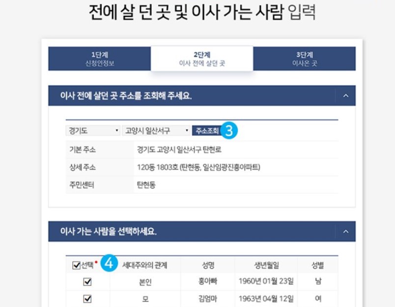 전입신고 2단계에서는 이사 전에 살던 주소를 조회해야 하는데 조회를 하면 이전 주소가 자동으로 나오고 이시가는 사람을 선택하는 화면이 나오므로 이사가는 사람을 선택한 후 다음 단계로 넘어가면 됩니다.