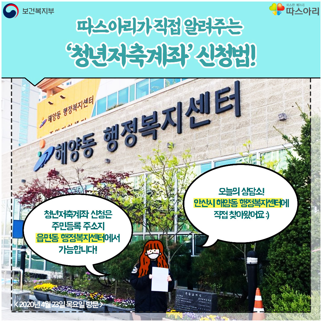 준비물이 전부 챙겼다면 이제 청년 저축계좌를 신청하러 각자가 속해계신 행정구역의 행정복지센터로 향하시면 됩니다! 알고 계시겠지만 행정복지센터가 이름이 바뀌어서 그런데 바꿔서 말씀드리자면 주민세터로 향하시면 됩니다.