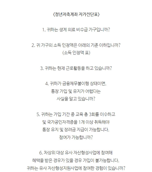 그리고 정부 혹은 지자체에서 시행 중인 여타 지원사업에 참여하고 있다면 청년 저축계좌의 대상자가 될 수 없어요. 희망키움통장이나 청년내일채움공제, 희망두배청년통장 등에 가입되어 있는 사람은 신청할 수 없다는 이야기입니다.