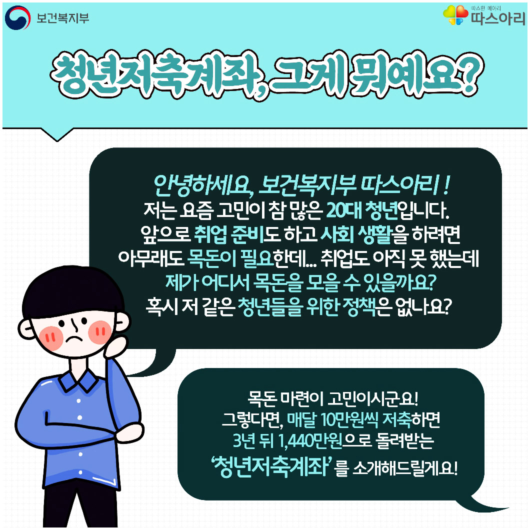 자연스럽게 그 모든 것들은 돈이라는 문제로 귀결되구요. 돈문제로 골머리를 안고 있을 청년들을 위해서 정부는 여러 정책과 지원사업을 통해서 돕고 있습니다. 청년 저축계좌는 그런 지원사업의 일종인데요. 청년저축계좌가 어떤건지, 조건, 혜택, 신청방법에 대한 총체적인 내용을 다뤄볼게요!
