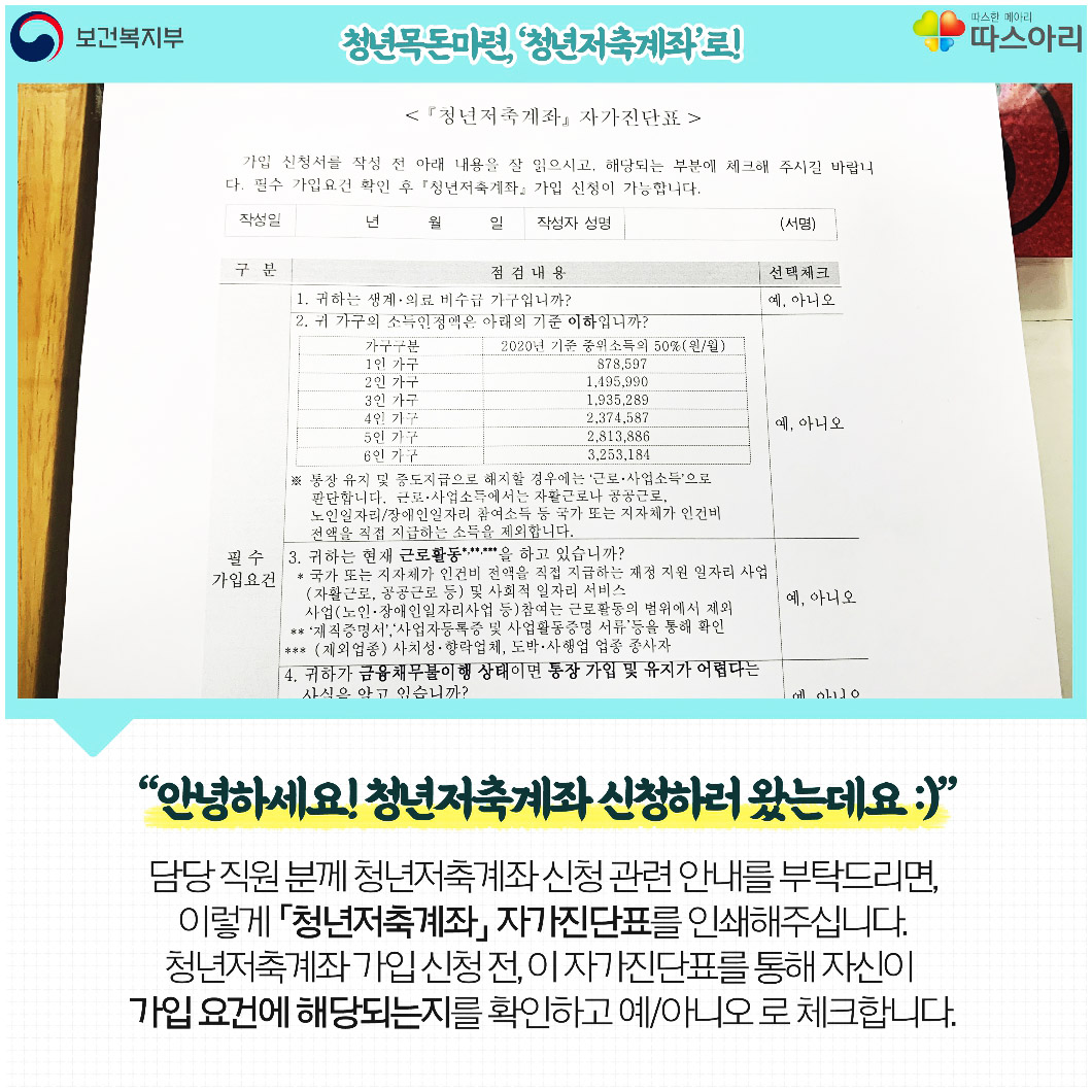 고소득자에게 이런 지원금을 줄 필요는 없겠죠? 기준 중위소득, 모든 세대들의 평균적인 소득의 수준의 50% 이하인 경우 청년 저축계좌 가입의 대상자가 됩니다. 기준중위소득이 1인가구일 경우는 1,757,194원이고 그 50%는 875,597원이니 그 이하인 경우에 대상자가 되는 식입니다. 각 세대별로의 중위소득과 그 50%에 해당하는 액수는 사진을 통해 자세히 게시할게요!