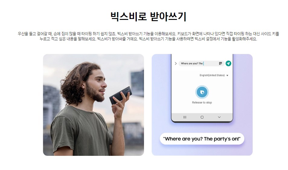 또한 빅스비 사용법으로 받아쓰기 기능을 이용할 수 있습니다.