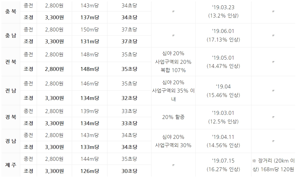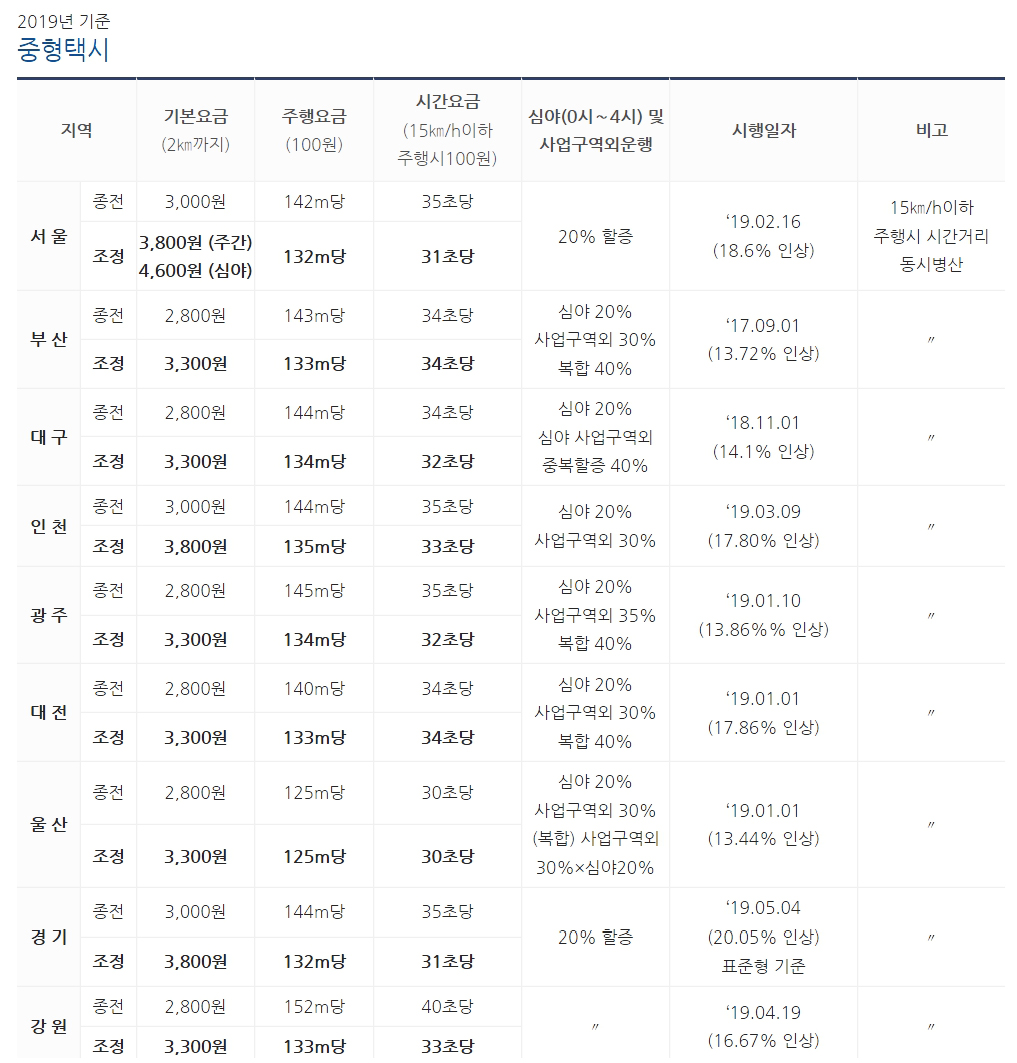 부산지역의 경우 기본요금 3,300원, 133m당, 34초당 100원씩, 할증요금이 20%가 부과됩니다. 또한 다른 지역에는 사업구역 외 운행이라는 것이 있는데 사업구역 외에서만 운행하는 경우 30%의 할증이 붙고 복합지역의 경우 40%의 할증이 붙는다고 합니다; 대구의 경우 기본요금 3,300원, 134m당, 32당 100원이 할증요금 20%가 부과됩니다. 그 밖의 다른 지역의 경우 표를 참고해주세요.
