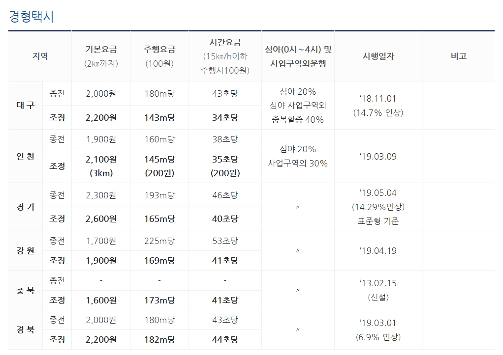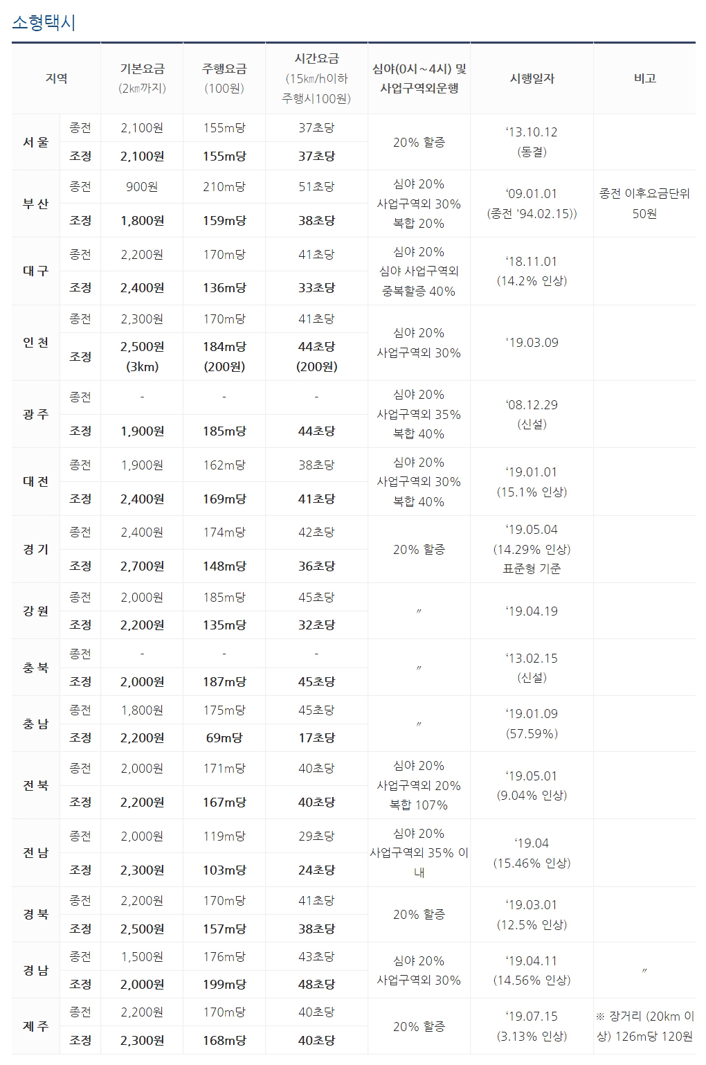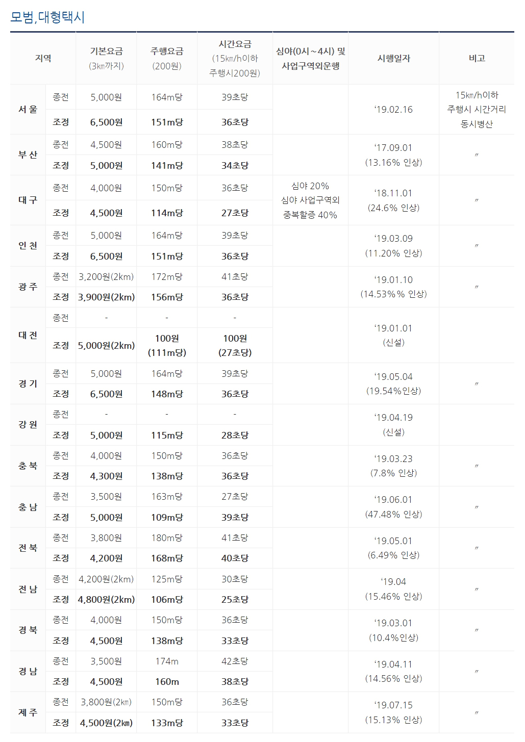 부산지역의 경우 기본요금 3,300원, 133m당, 34초당 100원씩, 할증요금이 20%가 부과됩니다. 또한 다른 지역에는 사업구역 외 운행이라는 것이 있는데 사업구역 외에서만 운행하는 경우 30%의 할증이 붙고 복합지역의 경우 40%의 할증이 붙는다고 합니다; 대구의 경우 기본요금 3,300원, 134m당, 32당 100원이 할증요금 20%가 부과됩니다. 그 밖의 다른 지역의 경우 표를 참고해주세요.