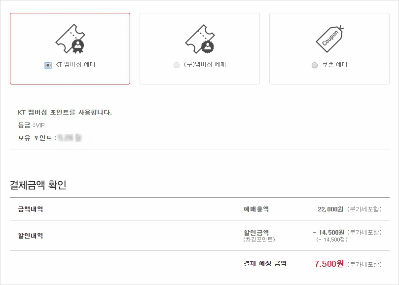 좌석 선택 후 [KT 멤버십 예매]로 하면 할인을 받을 수 있습니다. 전 아시다시피 VIP이기 때문에 제 영화비용은 무료(포인트차감)이고, 동반 1인만 7,500원 내고 보면 됩니다. 포인트 차감이라 꽁짜라고 말하긴 좀 그렇지만, 그래도 스타벅스 사이즈업 빼곤 사용할 곳이 없기 때문에 무료라고 생각하고 예매하고 있답니다.