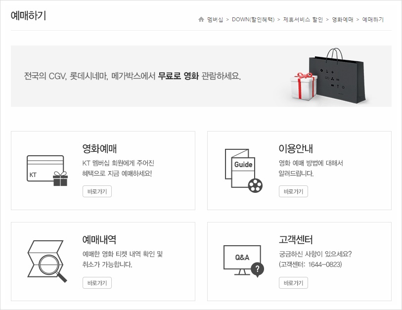 무엇보다 좋은 점은 영화관 3사 모두 예매가 가능하다는 점인 것 같습니다. 혹시라도 집 근처에 메가박스밖에 없는데 CGV와 롯데시네마만 할인혜택이 주어진다면 굉장히 속상할텐데 3사 모두 있으니 그런 불편함도 없고 KT측도 항의전화가 오지 않아 좋겠죠.