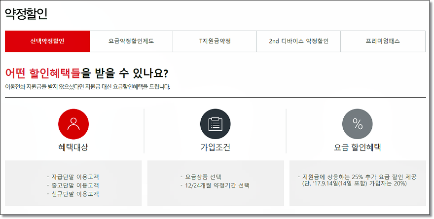 선택약정할인은 자급단말, 중고단말, 신규단말 이용고객만 사용할 수 있는 상품으로 12/24개월 기간을 선택해서 25% 할인 받을 수 있습니다. 기간에 따라 할인율이 차이나는 것은 아니니 12개월로 선택하는 것이 좋습니다.