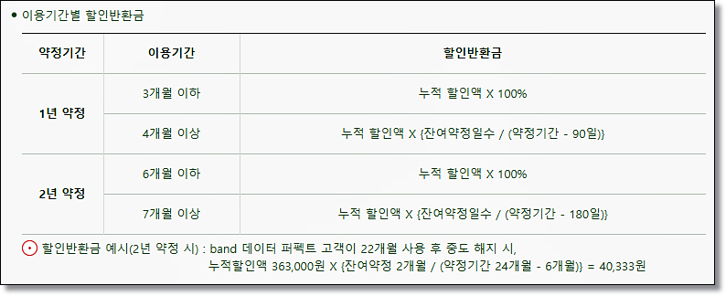 다음은 SKT 선택약정할인 해지 시 할인반환금 안내입니다. 1년 약정 3개월 이하일 경우 누적 할인액 100%를 반환해야하며 4개월 이상일 경우 누적 할인액X(잔여약정일수/(약정기간-90일))으로 계산하면 됩니다.