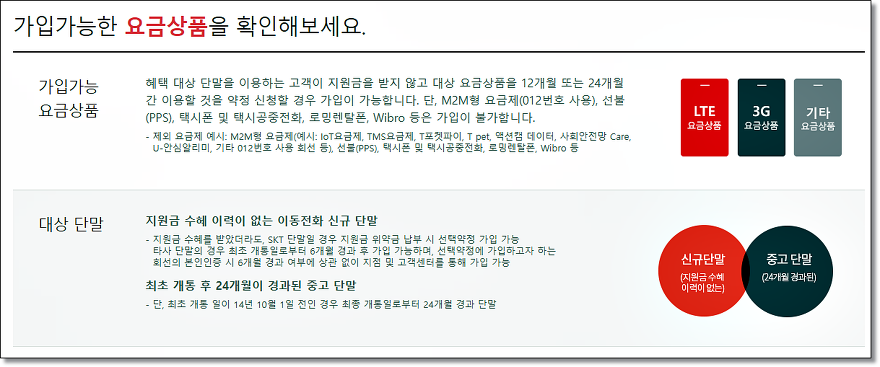 최초 개통 후 24개월이 지난 중고 단말기나 지원금 수혜 이력이 없는 신규 단말일 경우만 신청할 수 있습니다. 이해하기 쉽게 말하자면 2년~3년 약정이 끝난 분들이 가입할 수 있는 상품입니다.